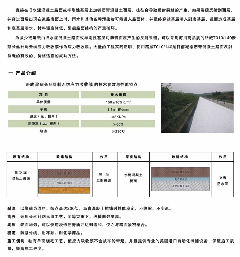 耐温:以聚酯为原料,熔点高达230摄氏度,沥青混凝土摊铺时性能稳定,不收缩,不变形;